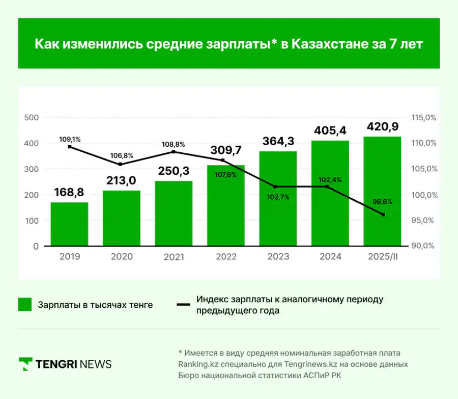 Средняя номинальная заработная плата в Казахстане за год увеличилась на 9,8 процента, достигнув 420,9 тысячи тенге. Однако, несмотря на рост, во втором квартале 2025 года покупательная способность населения снизилась на 1,4 процента по сравнению с аналогичным периодом 2024 года. Отрицательная динамика наблюдалась только в шести из 20 регионов страны.