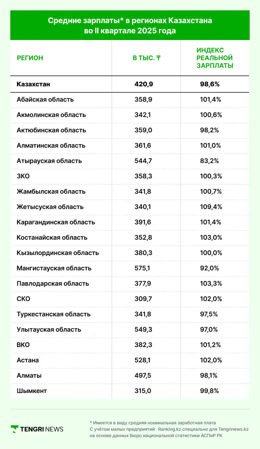 - 1. Мангистауская область — 575,1 тысячи тенге (на 36,6 процента выше среднего по стране);