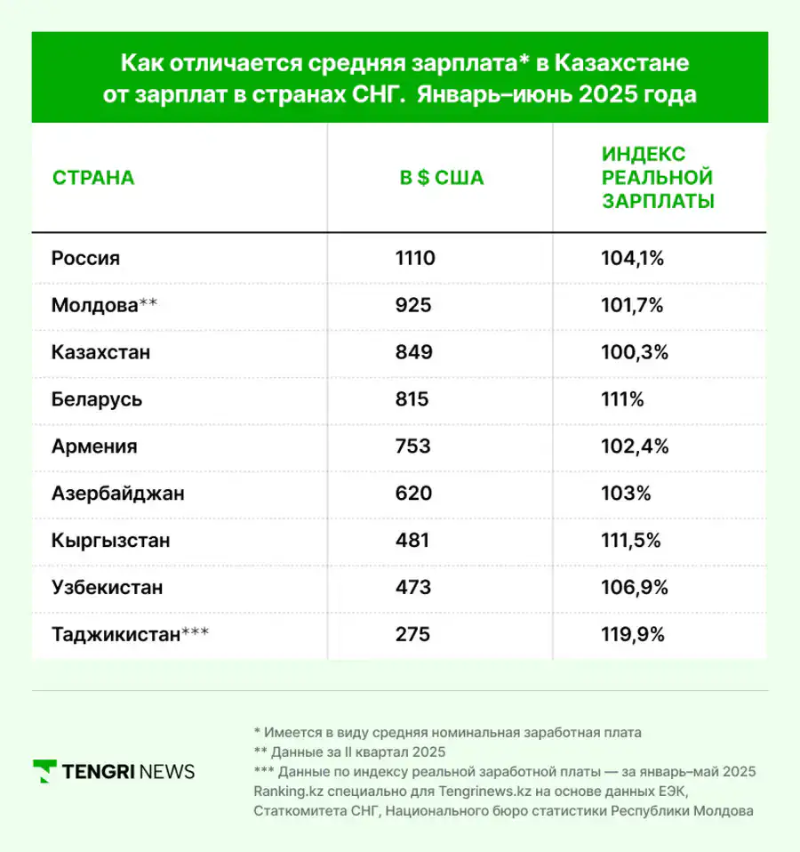 Сравнение средней номинальной зарплаты в Казахстане с другими постсоветскими странами показывает, что Казахстан занимает третье место. За январь – июнь 2025 года средняя зарплата составила 849 долларов США, уступая только Молдове (925 долларов) и России (1,1 тысячи долларов). В то же время, Казахстан занял последнее место среди стран СНГ по индексу реальной заработной платы, который составил всего 100,3 процента, что указывает на отсутствие роста покупательной способности.