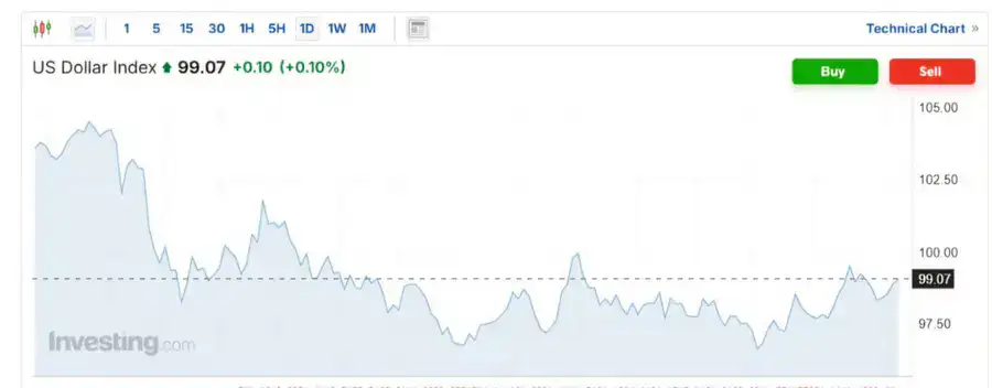 Индекс доллара США (U.S. Dollar Index, DXY) увеличился на 0,10 процента. Это произошло на фоне возвращения инвесторов к американской валюте как к безопасному активу. Слабые данные по инфляции в Великобритании также ослабили фунт, что усилило относительную силу доллара.