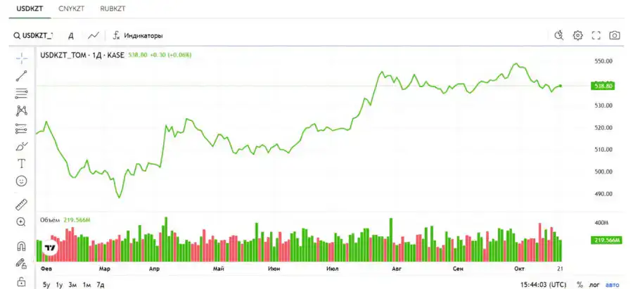На Казахстанской фондовой бирже (KASE) по состоянию на 15:30 по времени Астаны средневзвешенный курс доллара составил 538,53 тенге, что на 0,08 тенге ниже предыдущего значения. Официальный курс Национального банка на 22 октября составляет 538,56 тенге за доллар.