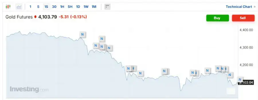 Золото продолжает дешеветь, так как инвесторы переключаются на другие активы. Укрепление доллара и рост доходности казначейских облигаций США делают вложения в драгметалл менее привлекательными. Фьючерс на золото снизился на 0,13 процента, достигнув 4 103,79 доллара за унцию.