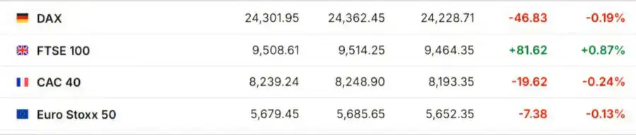 Европейские рынки показали разнонаправленную динамику. Большинство индексов, таких как DAX и CAC 40, снизились под давлением слабых корпоративных отчётов и возросшей геополитической неопределённости. В то же время FTSE 100 вырос благодаря более мягким, чем ожидалось, данным по инфляции в Великобритании, что снизило риск незапланированного повышения ставок. Из основных индексов Euro Stoxx 50 (-0,13 процента), DAX (-0,19 процента), CAC 40 (-0,24 процента) снизились, в то время как FTSE 100 (+0,87 процента) показал рост.