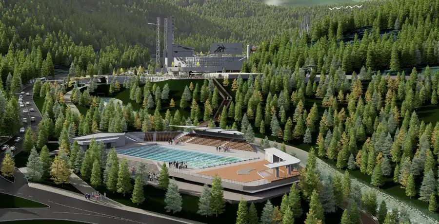 На прилегающей территории комплекса запланировано создание экопарка. Будут построены два новых пешеходных моста - восточный и западный, которые обеспечат связь между основными объектами и новыми зонами отдыха.