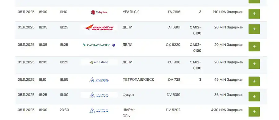 - Air Astana, KC 898 (Дубай) — задержка 2 часа 5 минут;