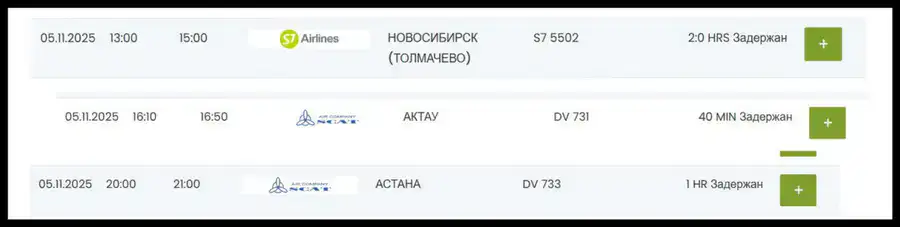 - Air Astana, KC 3024 (Усть-Каменогорск) — задержка 35 минут;