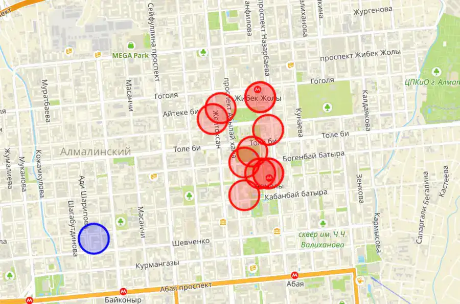 - Алмалинский район: район улиц Жамбыла (южнее), Ади Шарипова и Досмухамедова.