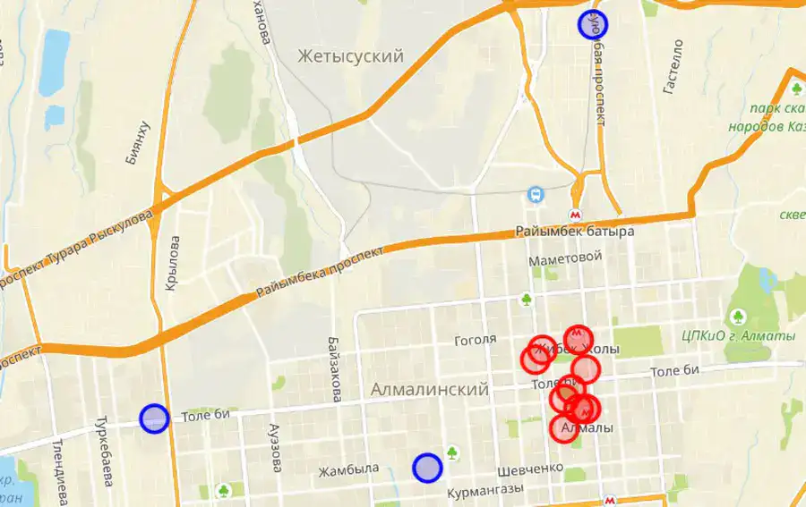 - Жетысуский район: район улиц Уйгурская, Акпаева, Бурхан и Колхозная.