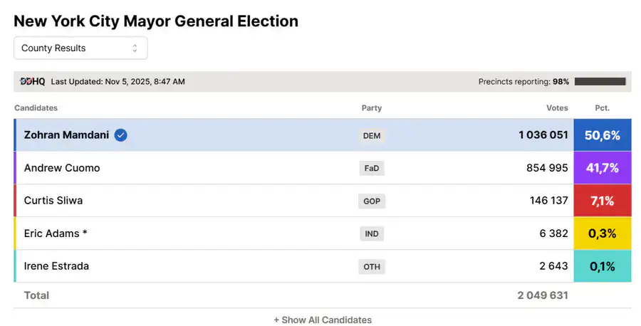 4 ноября 2025 года Зохран Мамдани одержал победу на выборах мэра Нью-Йорка, став первым мусульманином на этом посту. Его победа также символизирует значительные изменения в политическом ландшафте США, вызванные девятью месяцами правления Дональда Трампа, который, по мнению многих, привел к радикализации как правых, так и левых политических сил.