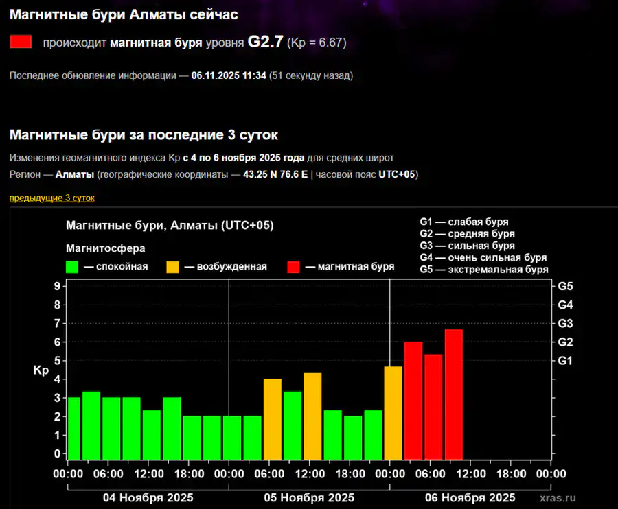 По предварительным расчетам, основное воздействие ожидается в ночь с 6 на 7 ноября и утром пятницы. В Алматы уже зарегистрирована буря уровня G2.7, и показатели продолжают расти.