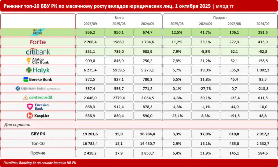 Согласно данным портала, абсолютным лидером месячного роста среди крупнейших БВУ стал Bank RBK: плюс 12,5 процента, до 956,2 миллиарда тенге. Для сравнения, в целом по топовой десятке банков месячный рост составил 2,9 процента.