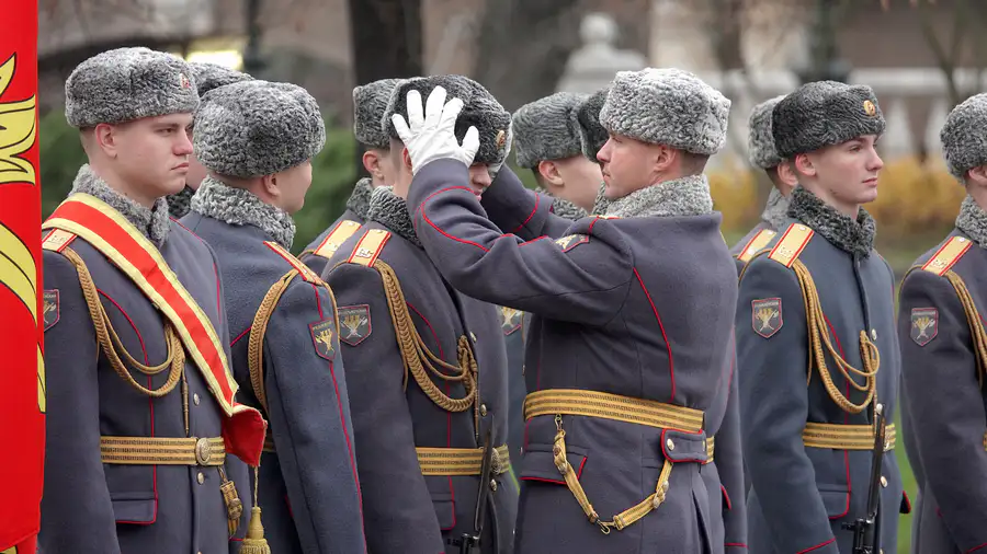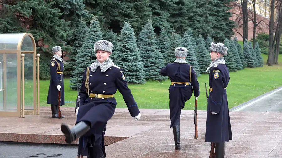 Они направляются в Большой Кремлевский дворец, где по кремлевской брусчатке проходят гвардейцы в четком строю.