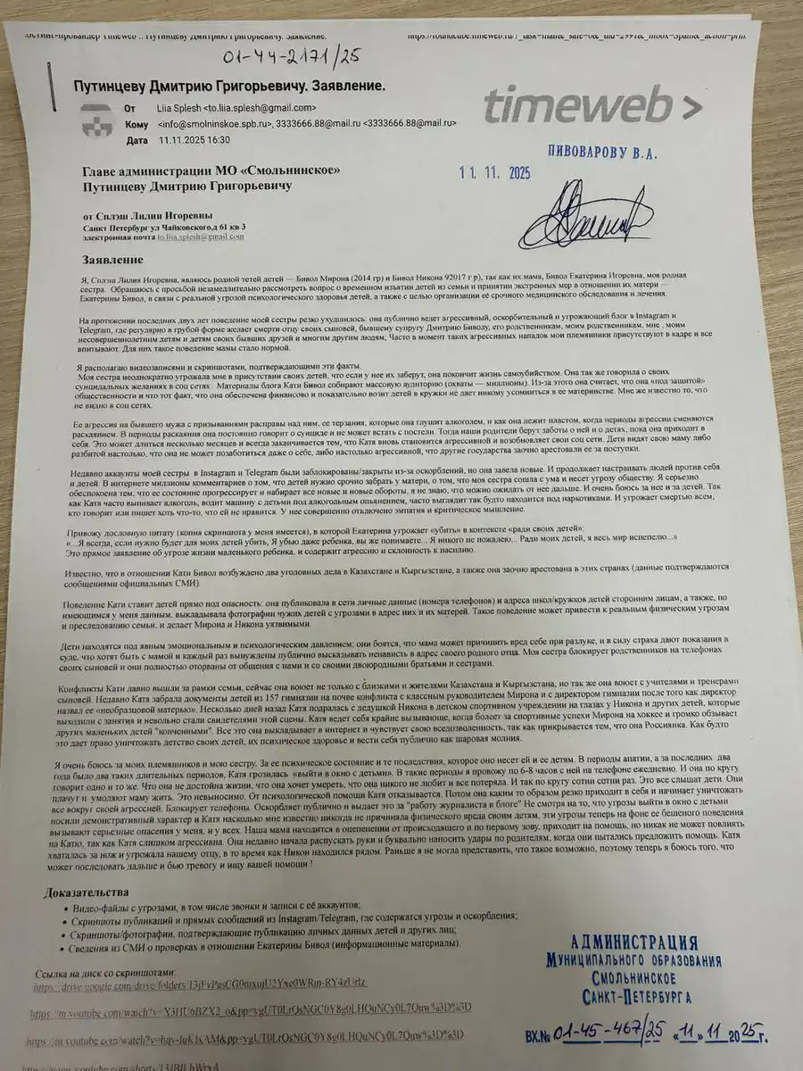 В документе также указано, что сестра Екатерины просит "рассмотреть вопрос о временном изъятии детей из семьи" и "принять меры в отношении их матери".