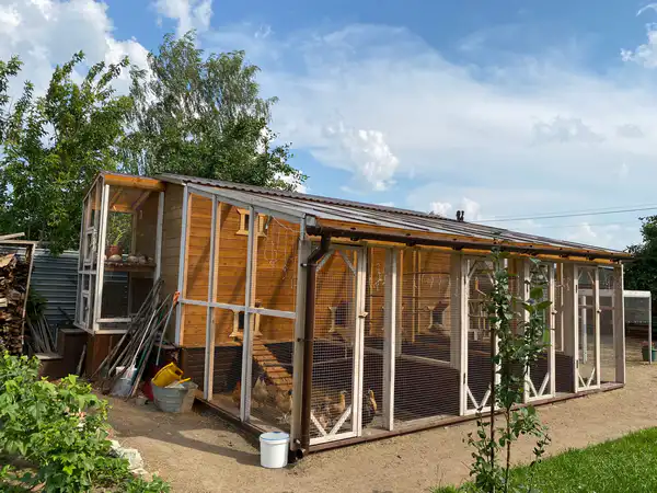 Девушка ко всему подходит очень серьёзно, даже тему с устройством курятника изучила досконально, и сделан он был по её собственному проекту на базе каркасно-модульной бани.