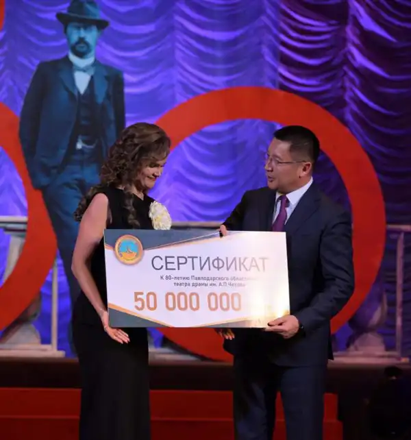 А потом глава региона по случаю юбилея сделал щедрый подарок: вручил работникам театра сертификат на сумму в 50 миллионов тенге!