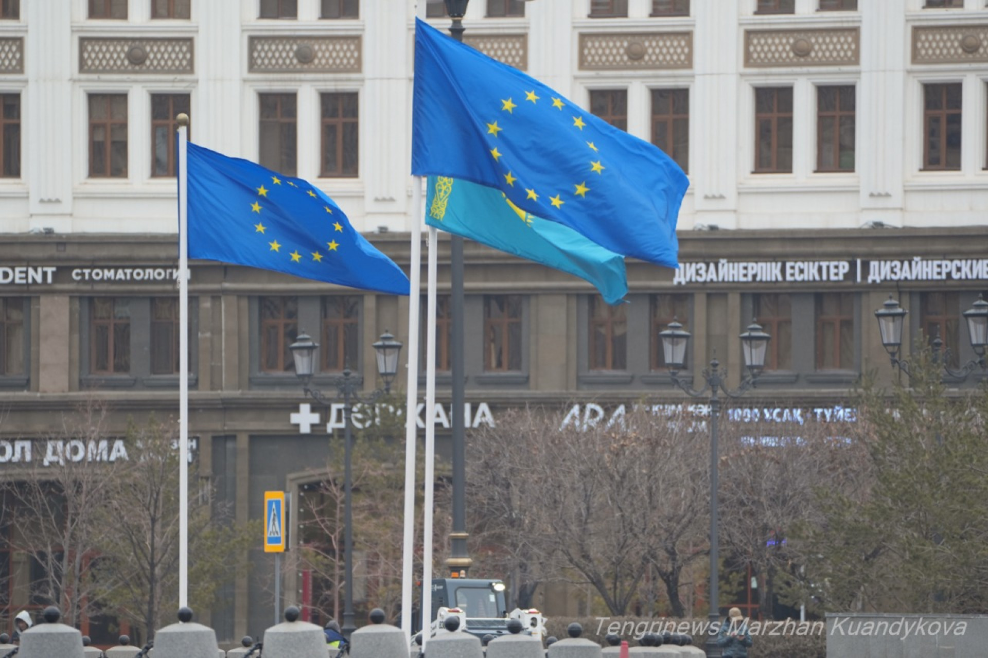 В преддверии его приезда на центральном проспекте столицы вывесили государственные флаги Казахстана и Европейского союза.