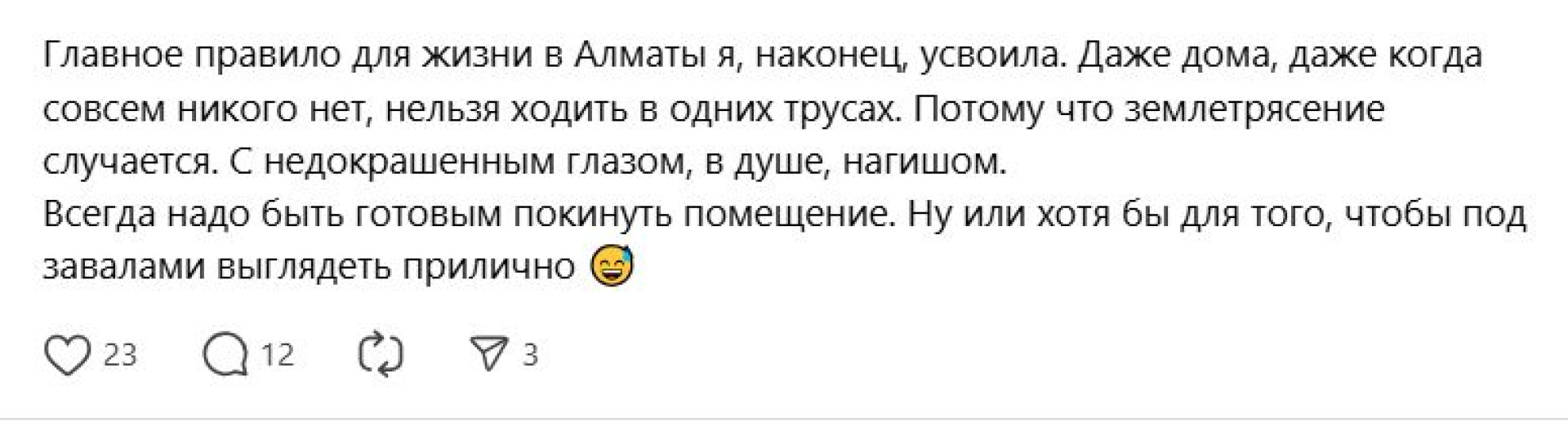 "Главное правило для жизни в Алматы я, наконец, усвоила. Даже дома нельзя ходить в одних трусах. Потому что землетрясение случается — с недокрашенным глазом, в душе, нагишом. Всегда надо быть готовым покинуть помещение. Ну или хотя бы для того, чтобы под завалами выглядеть прилично", — пошутила автор поста.
