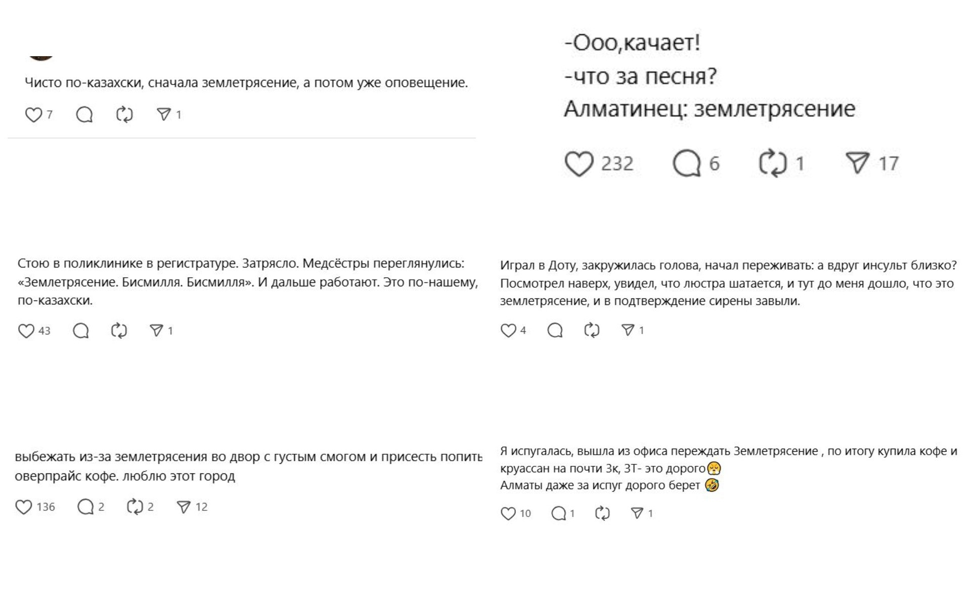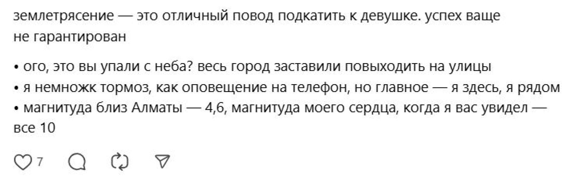 "Землетрясение — это отличный повод подкатить к девушке. Успех вообще не гарантирован. "Ого, это вы упали с неба? Весь город заставили повыходить на улицы". "Я немножко тормоз, как оповещение на телефон, но главное — я здесь, я рядом". "Магнитуда близ Алматы — 4,6, магнитуда моего сердца, когда я вас увидел — все 10", — говорится в одном из постов.