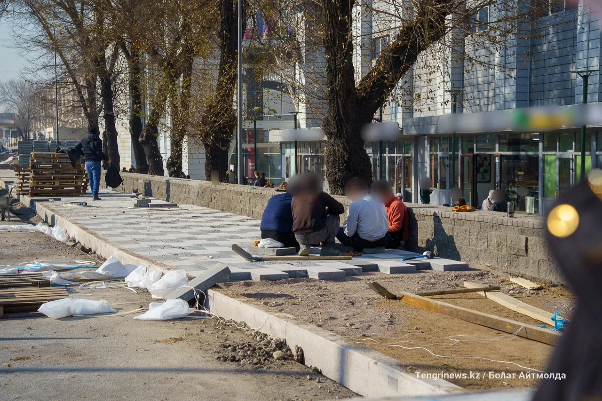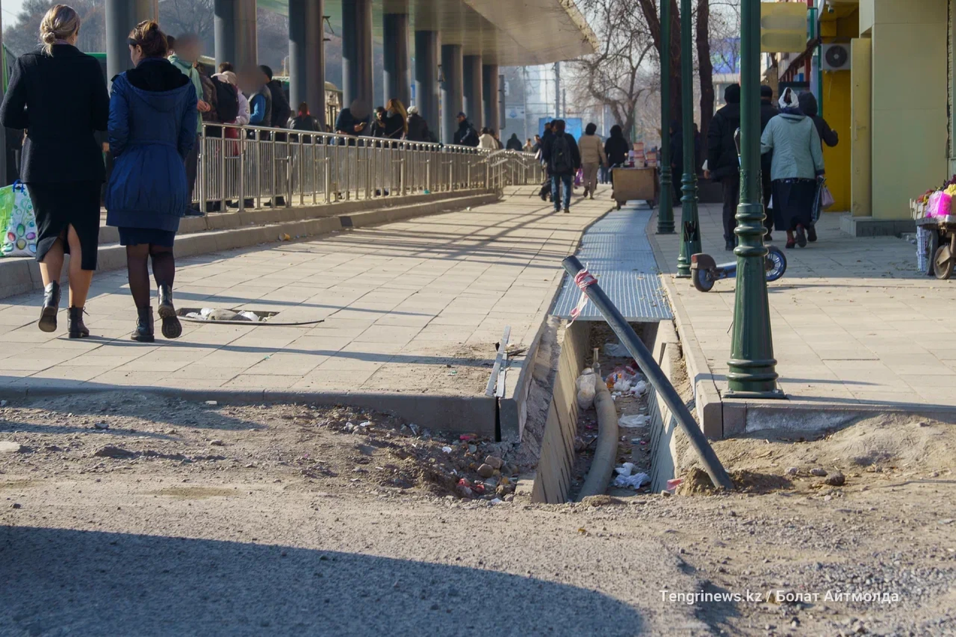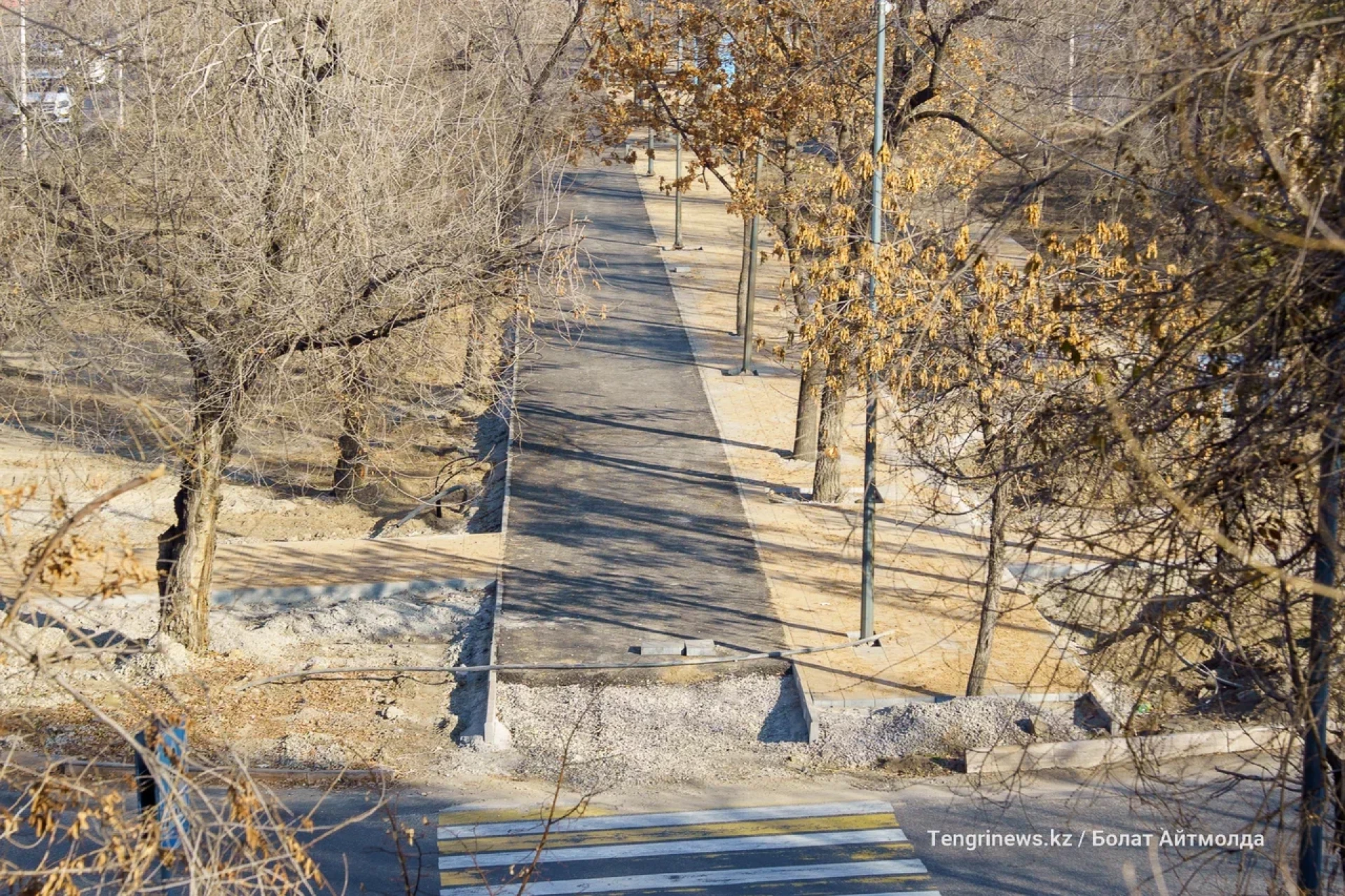 От пересечения Райымбек батыра с улицой Боткина до улицы Тлендиева корреспонденты Tengrinews.kz заметили активное строительство велопешеходной аллеи.