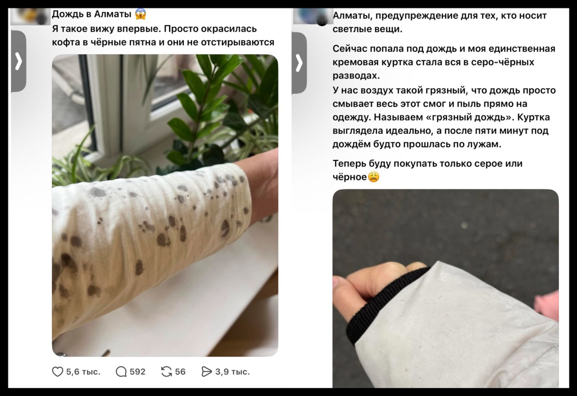 "Если бы дождь был химически опасным или кислым, наблюдались бы характерные признаки — запах, коррозия металлов, ожоги на листьях растений и так далее. В данном случае этого не отмечено. Появление тёмных пятен на одежде — это результат вымывания из атмосферы накопившихся частиц пыли и сажи первым дождём. Это природное явление, но оно служит индикатором повышенного уровня загрязнения воздуха в Алматы", — подытожили экологи.