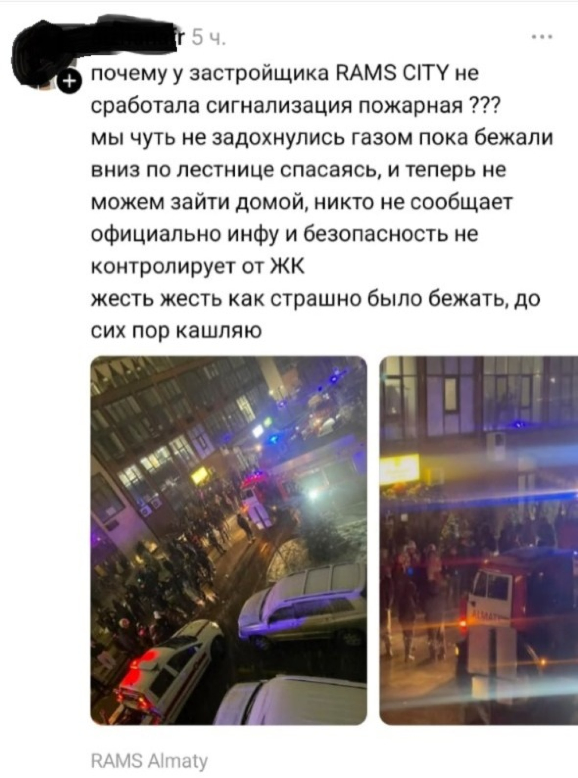 Ранее жительница Алматы опубликовала в соцсетях пост, в котором рассказала о ночном пожаре в их ЖК. Людям пришлось эвакуироваться, пробираясь через дым.