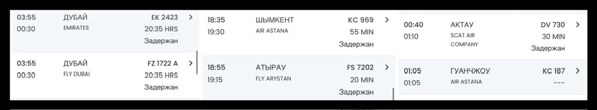 - Air Astana, KC 898 (Дубай) — задержка 2 часа 45 минут;