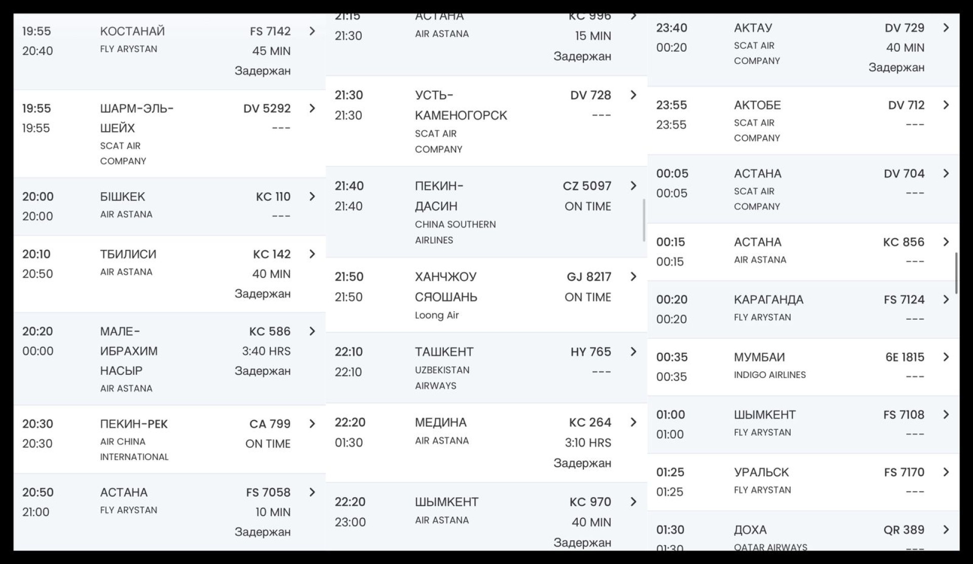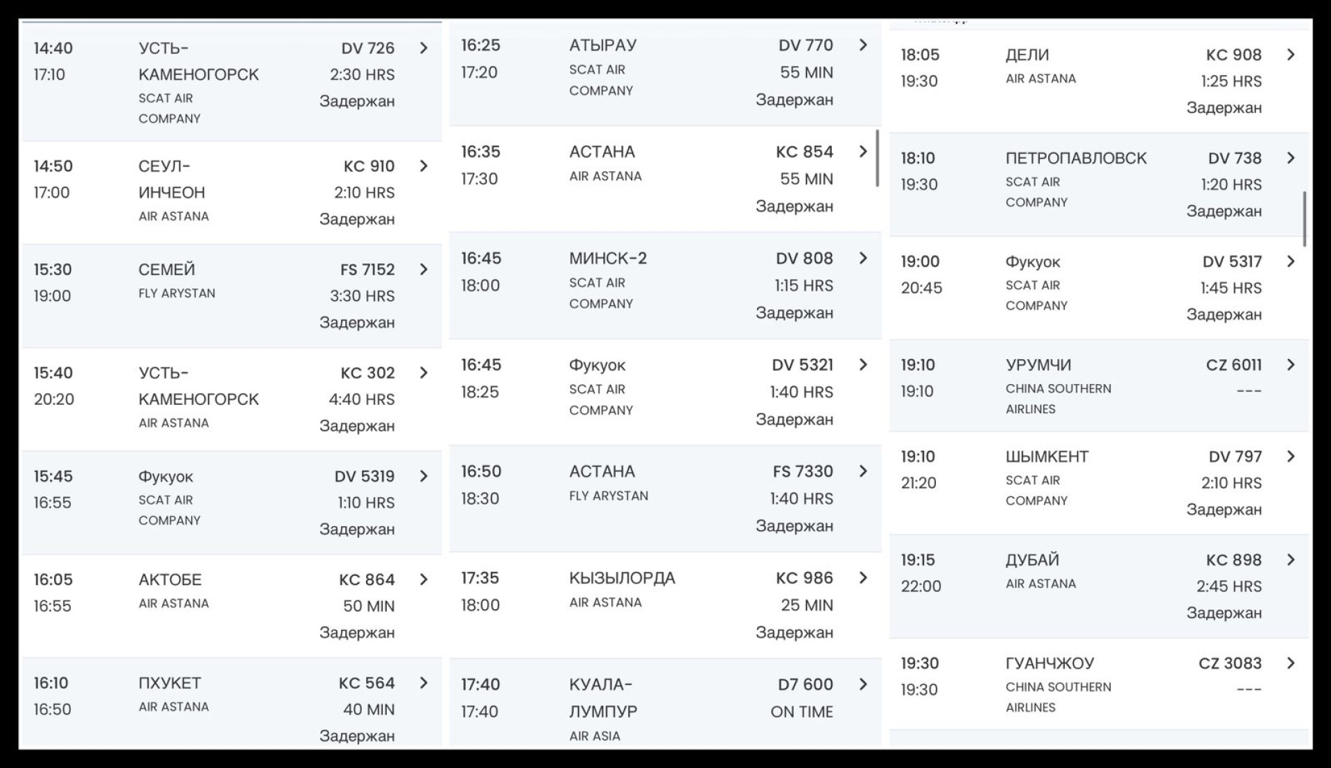 - Air Astana, KC 970 (Шымкент) — задержка 40 минут.