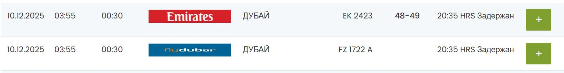 - Emirates, EK 2423 (Дубай) — задержка 20 часов 35 минут;