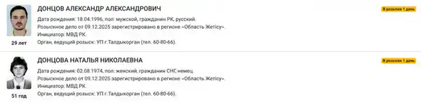 По данным ориентировки, разыскное дело на Александра и Наталью Донцовых было зарегистрировано 9 декабря в области Жетысу. Инициатором розыска выступило Министерство внутренних дел, а управление полиции Талдыкоргана ведёт его.