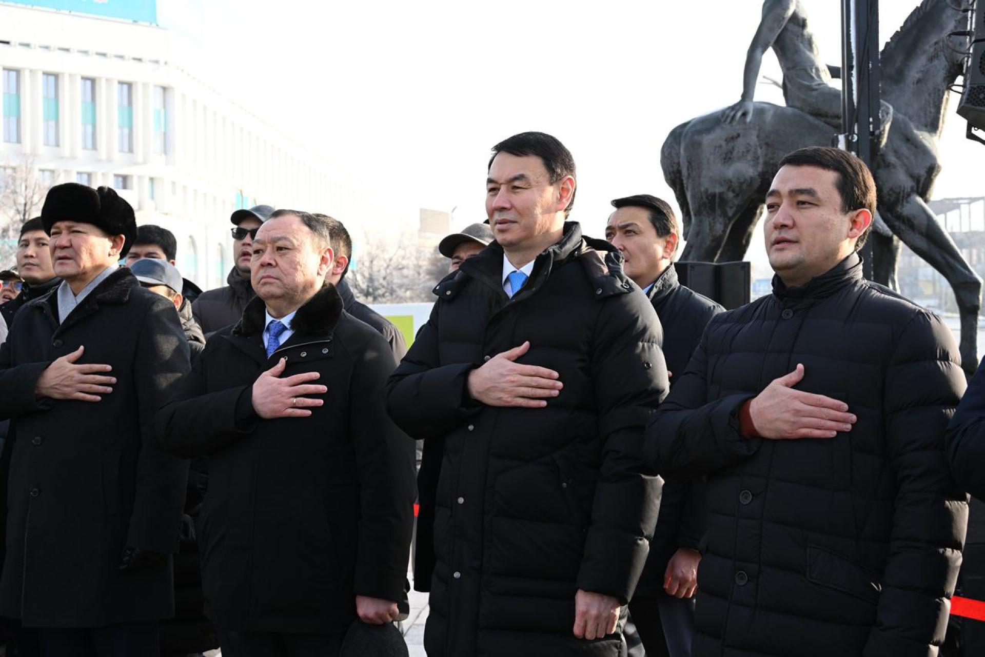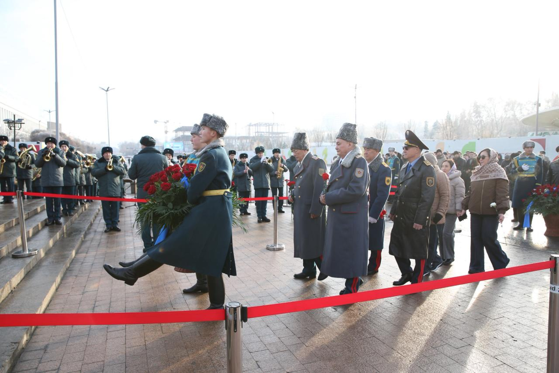 Участники церемонии возложили цветы к Монументу и почтили память героев, пожертвовавших своими жизнями ради свободы и независимости страны, минутой молчания. Церемония завершилась исполнением Государственного гимна Казахстана в сопровождении военно-духового оркестра Алматинского регионального гарнизона.