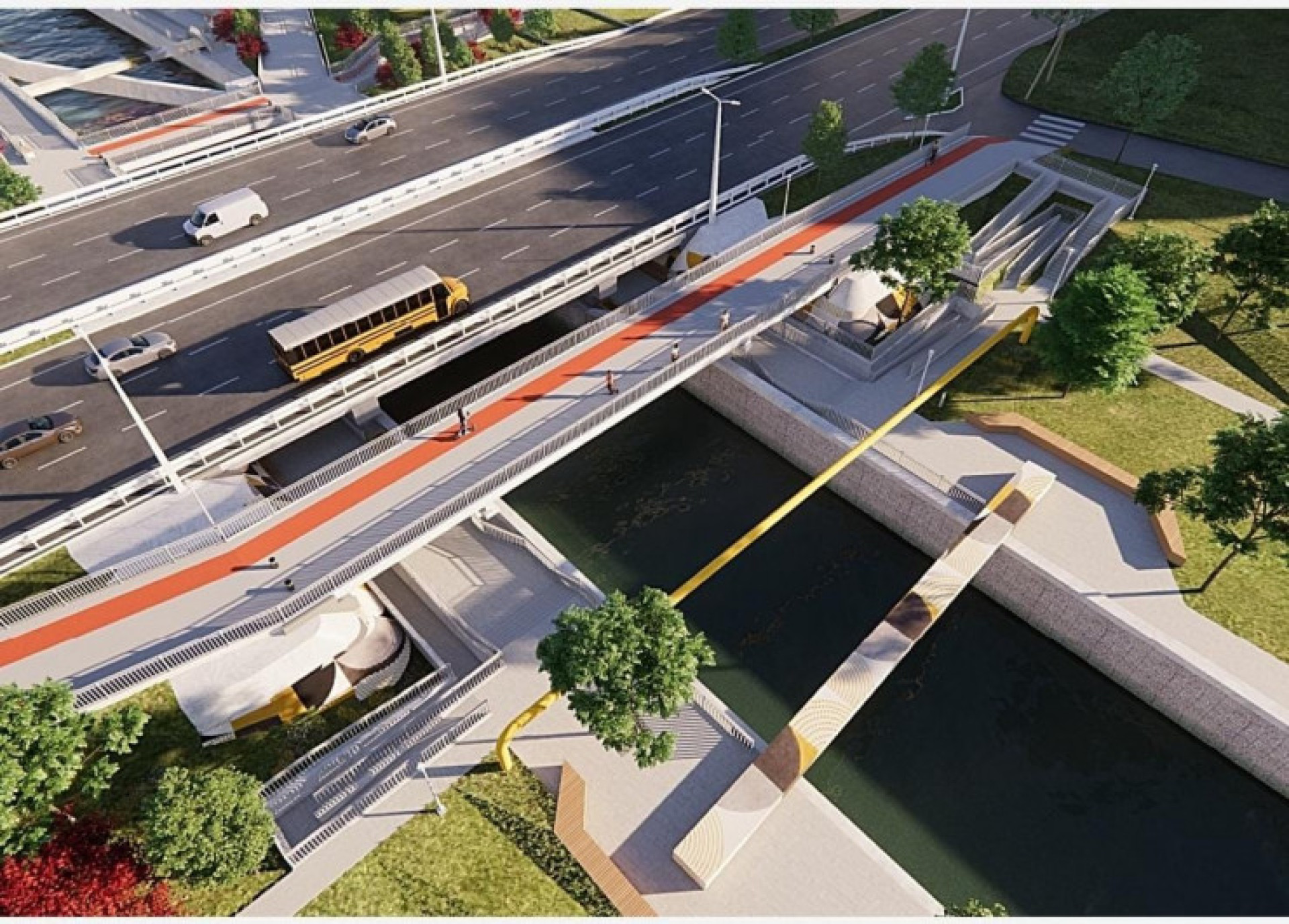 Он также рассказал, какие проблемы возникли с пешеходными мостами. Исходный проект предполагал два отдельных моста, однако после выезда на место с общественниками и обсуждения вопроса вырубки зелёных насаждений управление решило внести изменения. Обновлённый проект сейчас проходит госэкспертизу.
