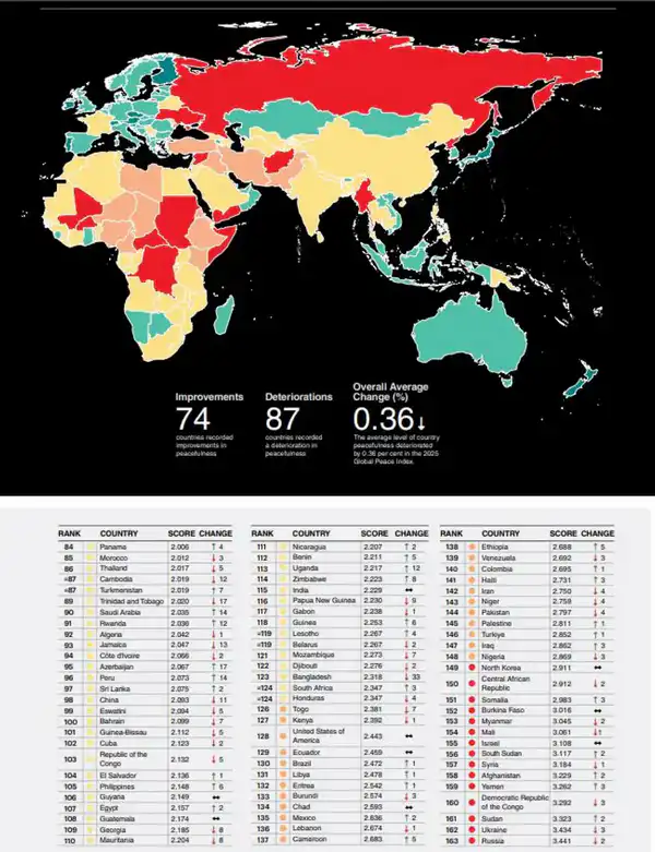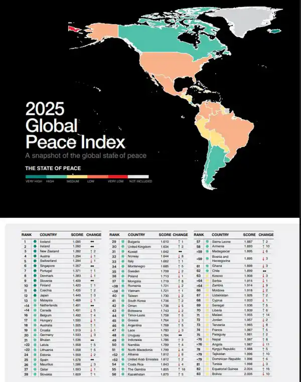 Институт экономики и мира (IEP) представил Global Peace Index 2025, который анализирует уровень безопасности и миролюбия в 163 странах и территориях, охватывающих 99,7% населения планеты.