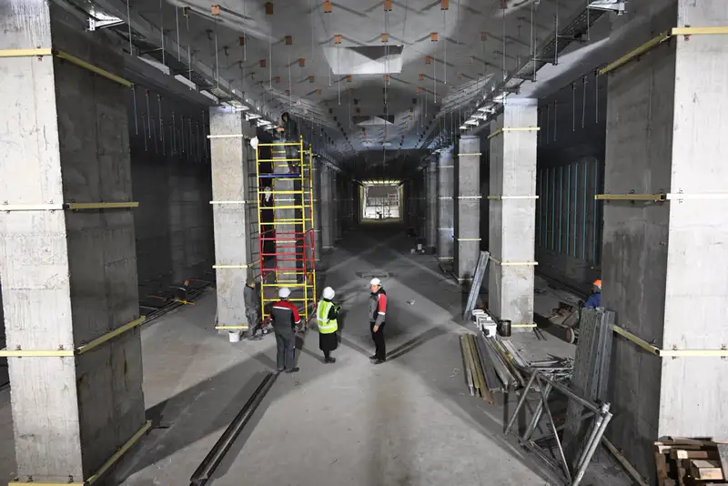На станции "Калкаман" продолжаются монолитные и отделочные работы, прокладываются коммуникации и готовится монтаж оборудования.