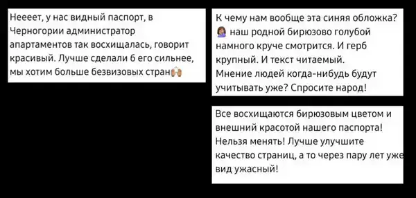 Сразу после появления "слитого" дизайна в сети, мнения пользователей разделились. Некоторые считают новый вариант современным и аккуратным, однако большинство высказались за сохранение действующего бирюзового паспорта.