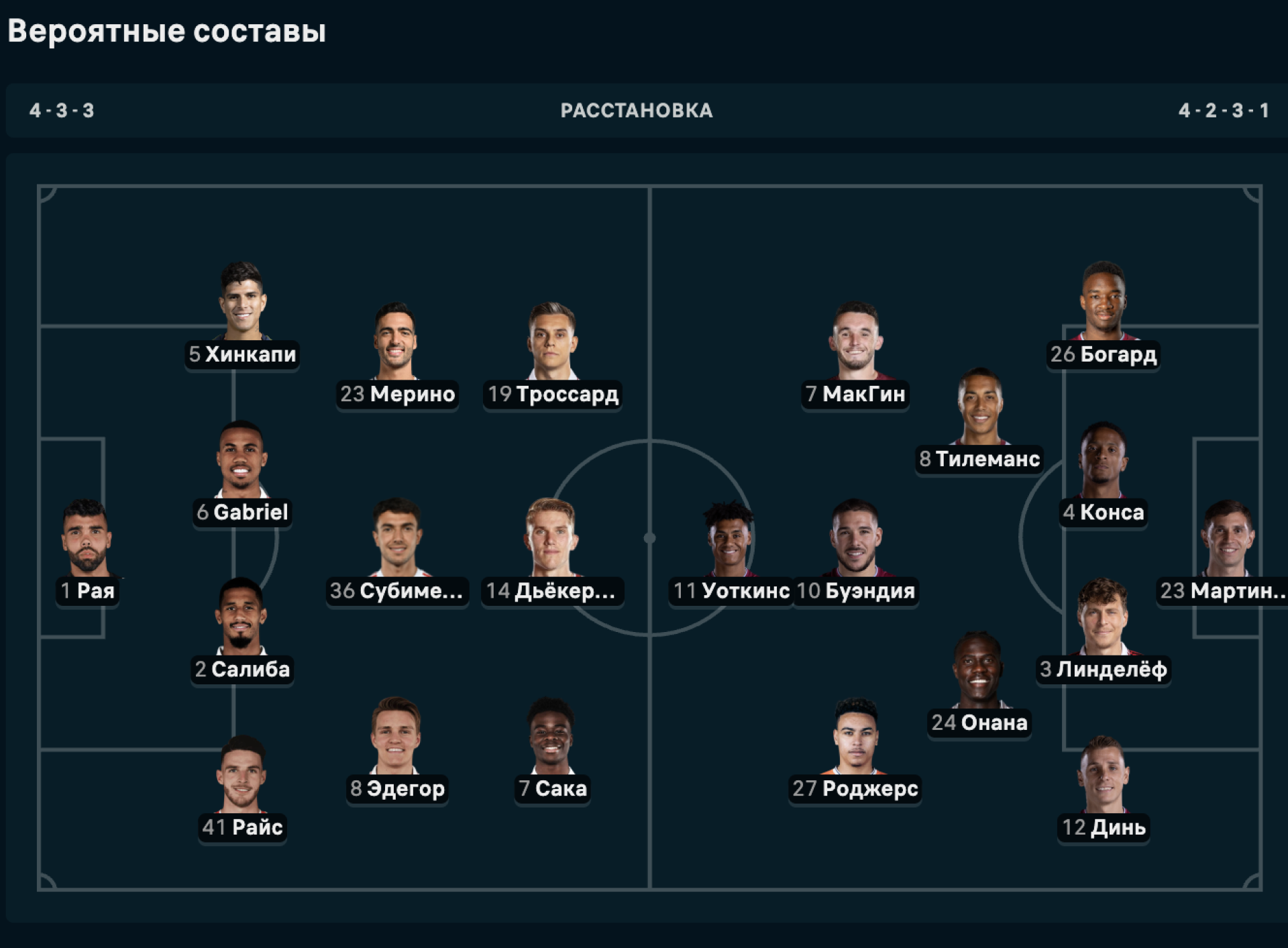 "Арсенал": Рая (В), Райс, Салиба, Габриэл, Хинкапи, Субименди, Мерино, Эдегор, Сака, Троссард, Дьёкереш.
