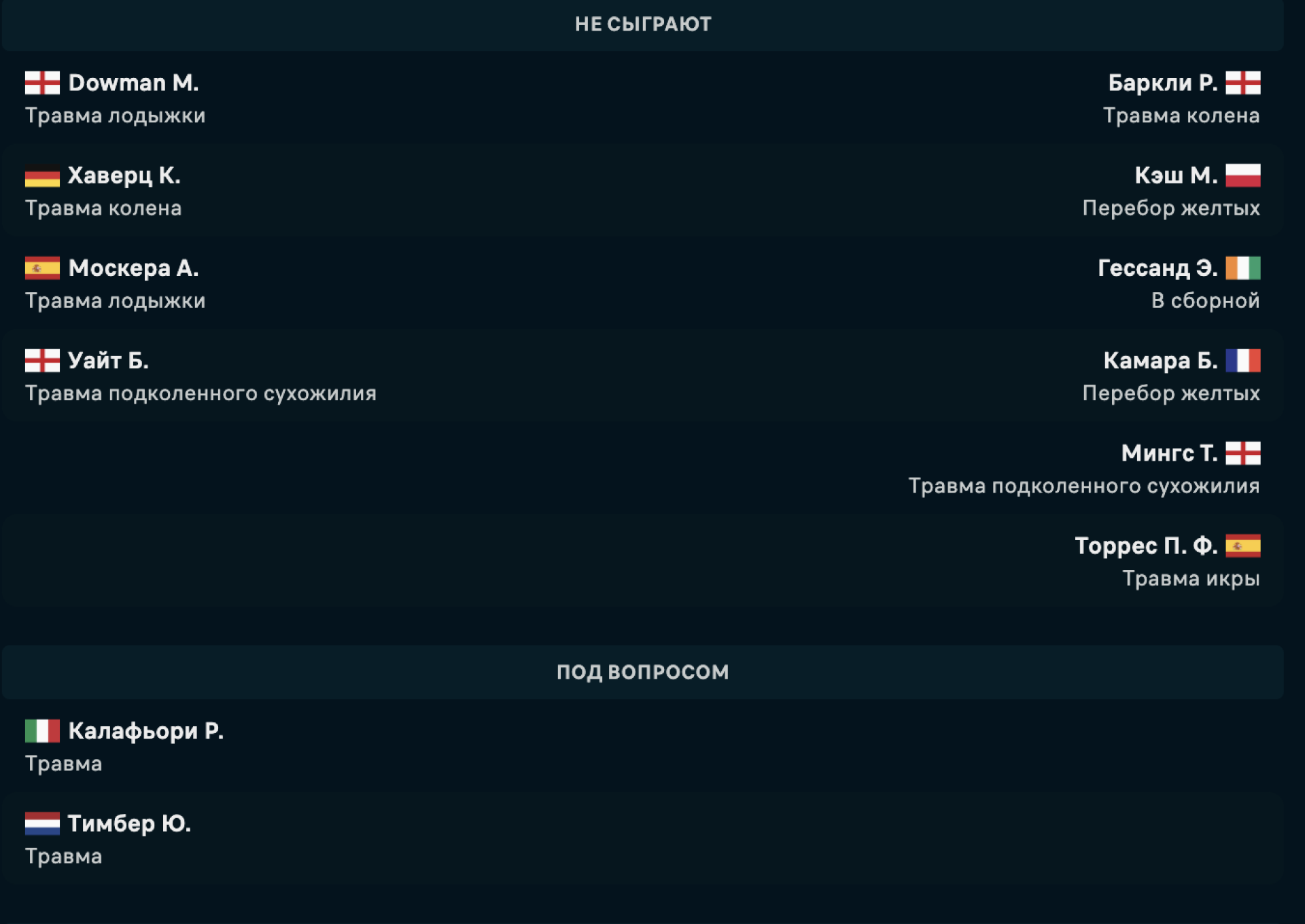 У обеих команд есть ряд футболистов, которые находятся в списке травмированных, у "Арсенала" это защитники Кристиан Москера и Бен Уайт, полузащитник Макс Доуман и форвард Кай Хаверц. Также под вопросом участие защитников Рикардо Калафьори и Юрриена Тимбера.