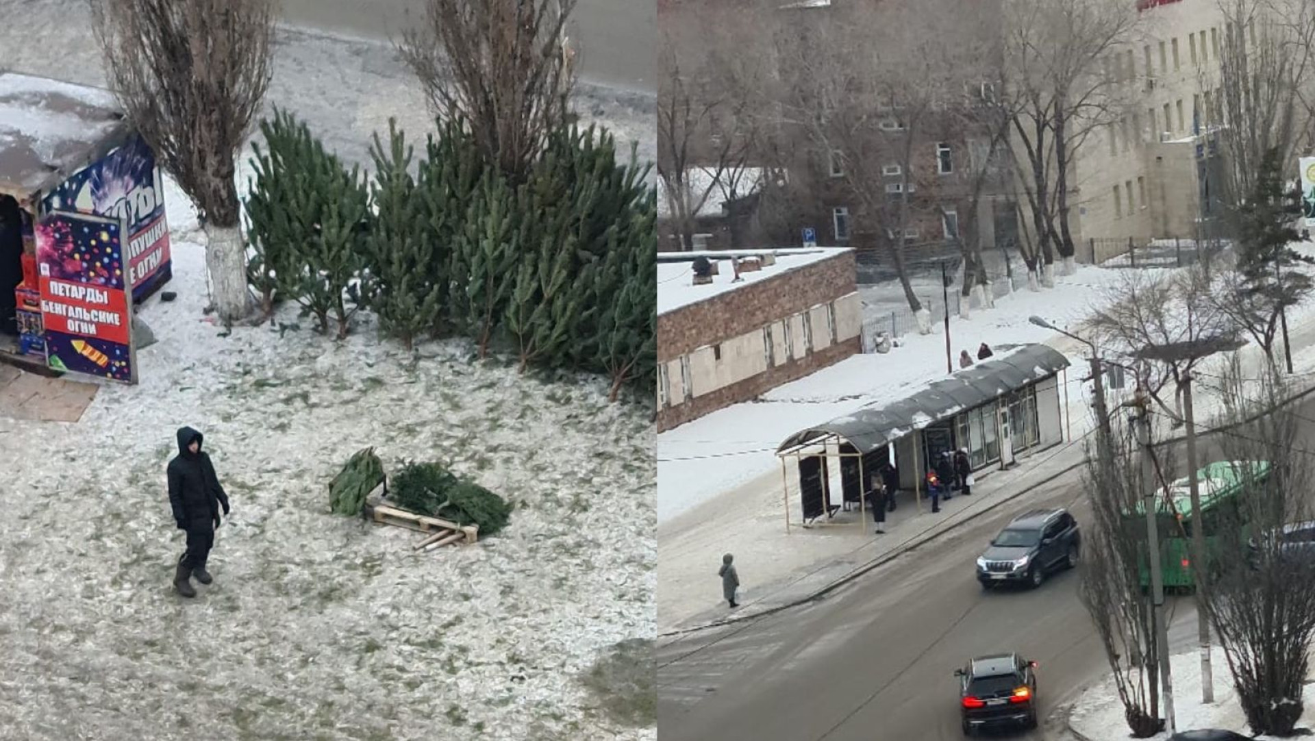 В Павлодаре температура -6 градусов. На фотографиях видно, как местный житель продаёт ёлки, а другие горожане ожидают автобус.