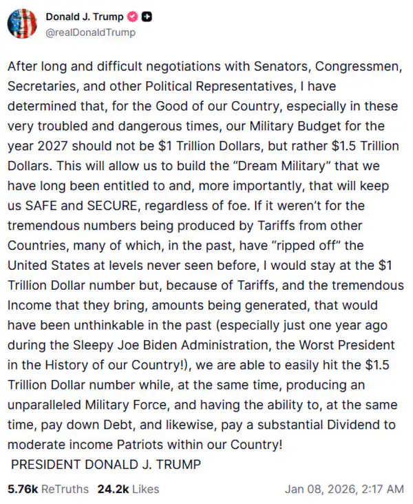 Карлсон указывает на рекордный запрос президента США Дональда Трампа на увеличение бюджета Пентагона до 1,5 триллиона долларов, что в полтора раза больше текущего уровня. Трамп отметил в своем посте, что это финансирование позволит создать "армию мечты", способную защитить страну от любых угроз.