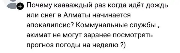 Алматинцы, застрявшие в многочасовых пробках, традиционно выплеснули эмоции в социальных сетях и в комментариях сервиса 2GIS. Среди десятков сообщений встречались как гневные претензии к коммунальным службам, так и ироничные и шутливые предложения: