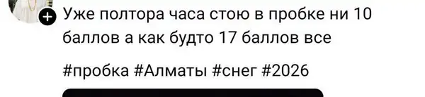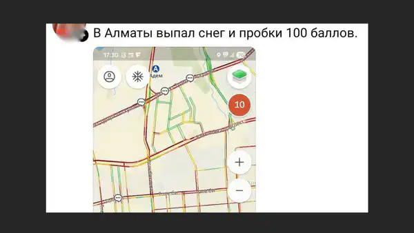 Некоторые алматинцы с юмором отмечают, что дорожная ситуация сегодня далека от обычных 10 баллов - по ощущениям пробки тянут сразу "на все 17" или даже "на все 100".