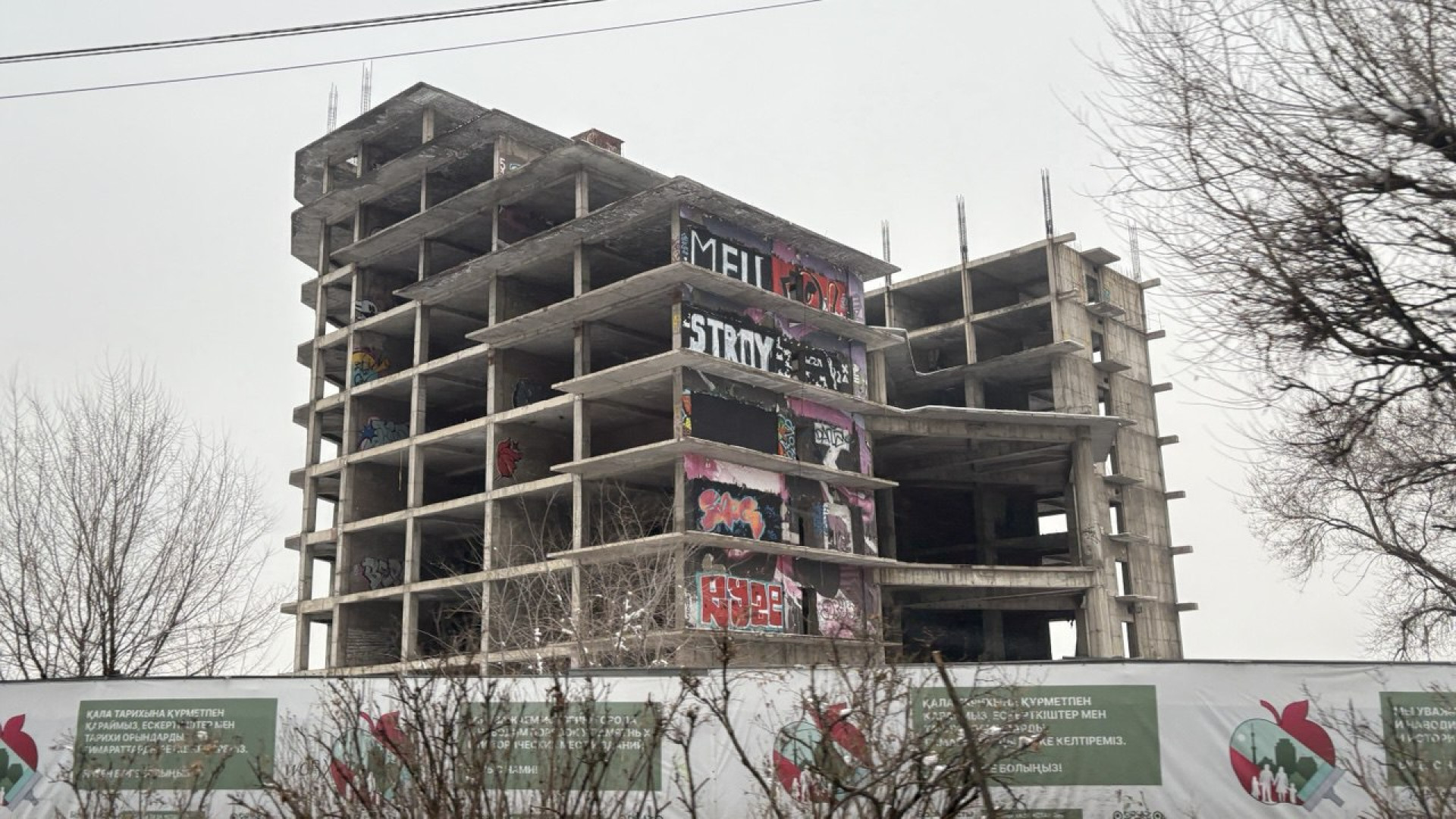 В ноябре 2025 года на недостроенном здании на пересечении проспекта Абая и улицы Тлендиева появились крупные граффити с никнеймом белорусского стримера Андрея Бурима, известного как Mellstroy. Жители соседних домов выразили недовольство из-за размещения на здании имени блогера, объявленного в международный розыск по обвинению в незаконной организации игорного бизнеса.