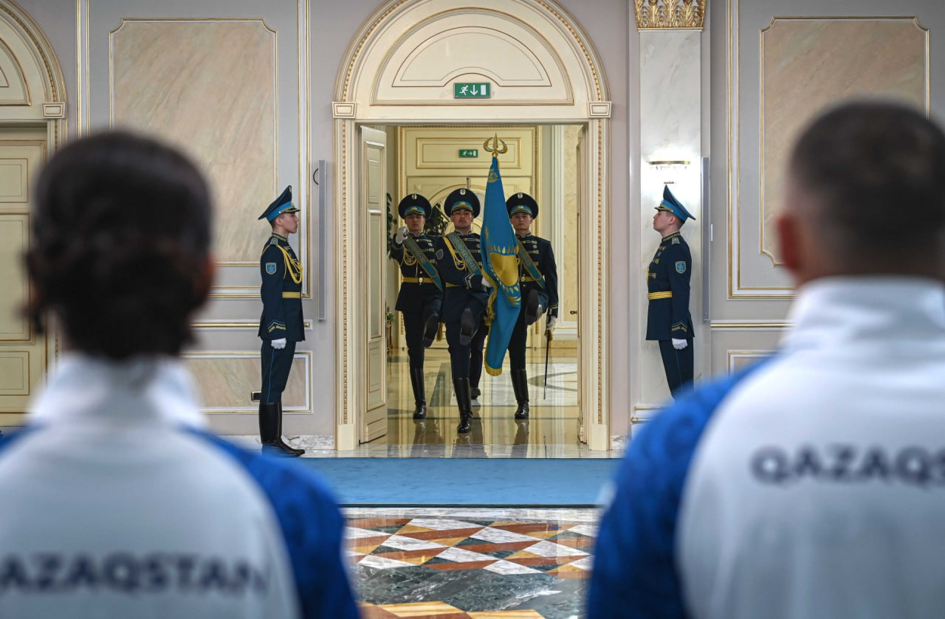 Президент вручил Государственный флаг Республики Казахстан членам национальной сборной — Денису Никише, Аяулым Амреновой и Ерболу Хамитову, члену паралимпийской сборной.