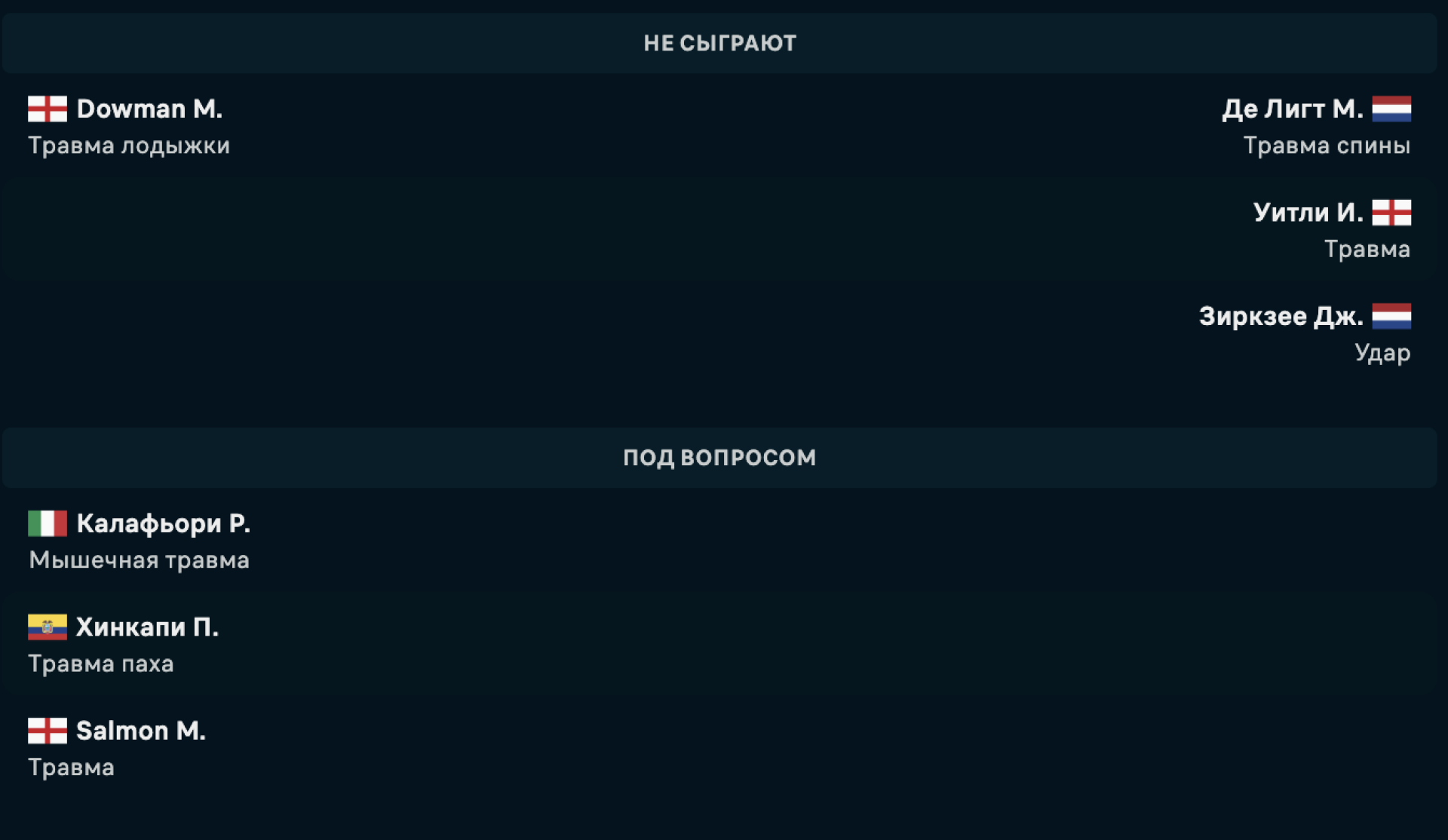 В составе "Манчестер Юнайтед" отсутствуют из-за травм нидерландцы Маттейс Де Лигт и Джошуа Зиркзее.