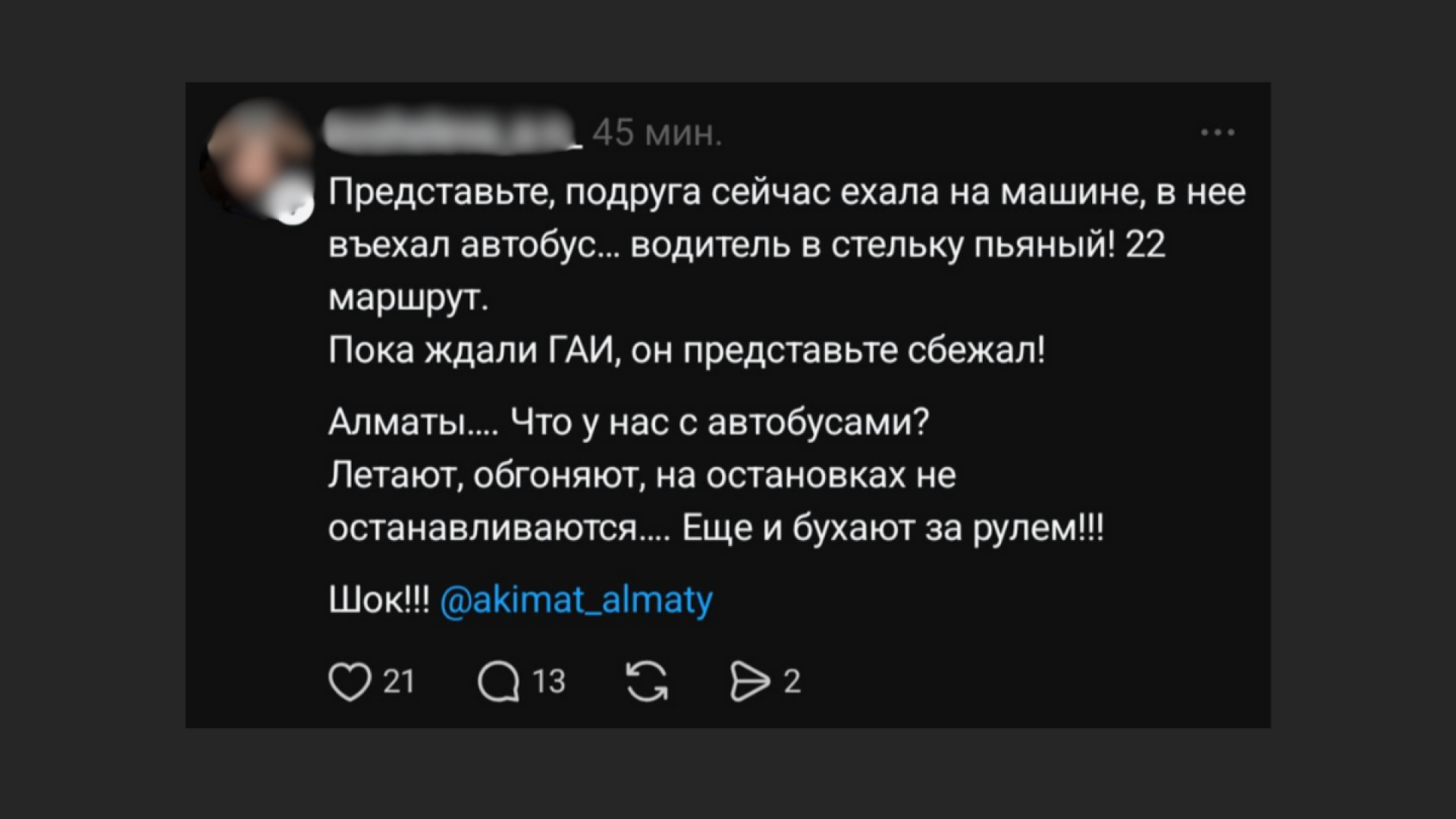 "Представьте, подруга сейчас ехала на машине – в неё въехал автобус. Водитель в стельку пьяный! 22-й маршрут. Пока ждали ГАИ, он, представьте, сбежал. Что у нас с автобусами? Летают, обгоняют, на остановках не останавливаются. Ещё и бухают за рулём! Шок", – написала автор публикации.