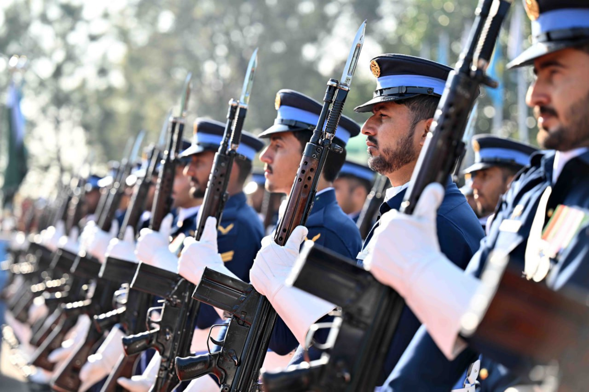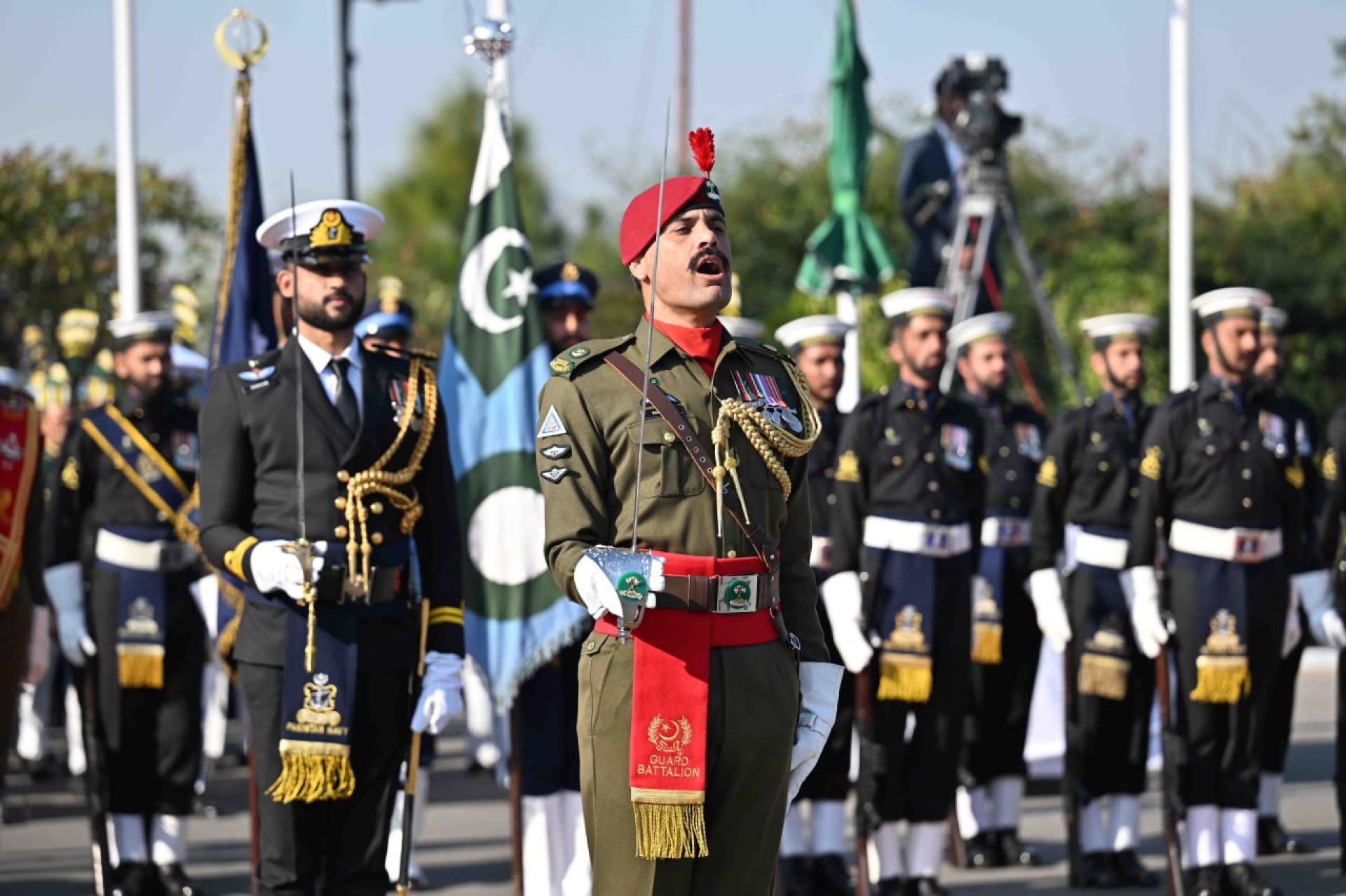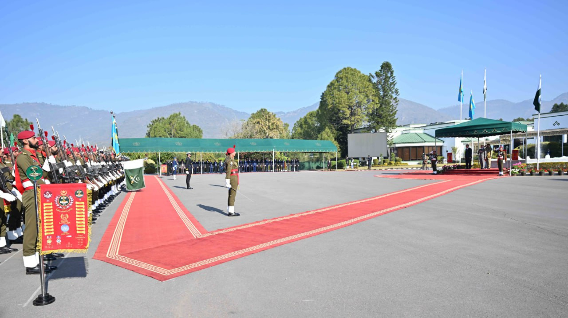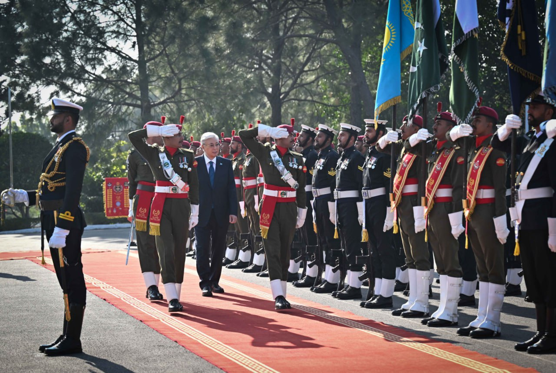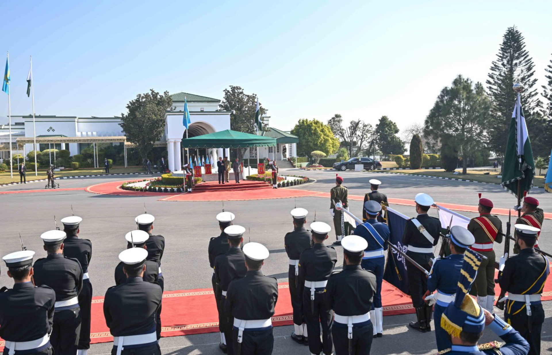 После совместного фотографирования были исполнены национальные гимны Казахстана и Пакистана, а также заслушан рапорт начальника почетного караула.
