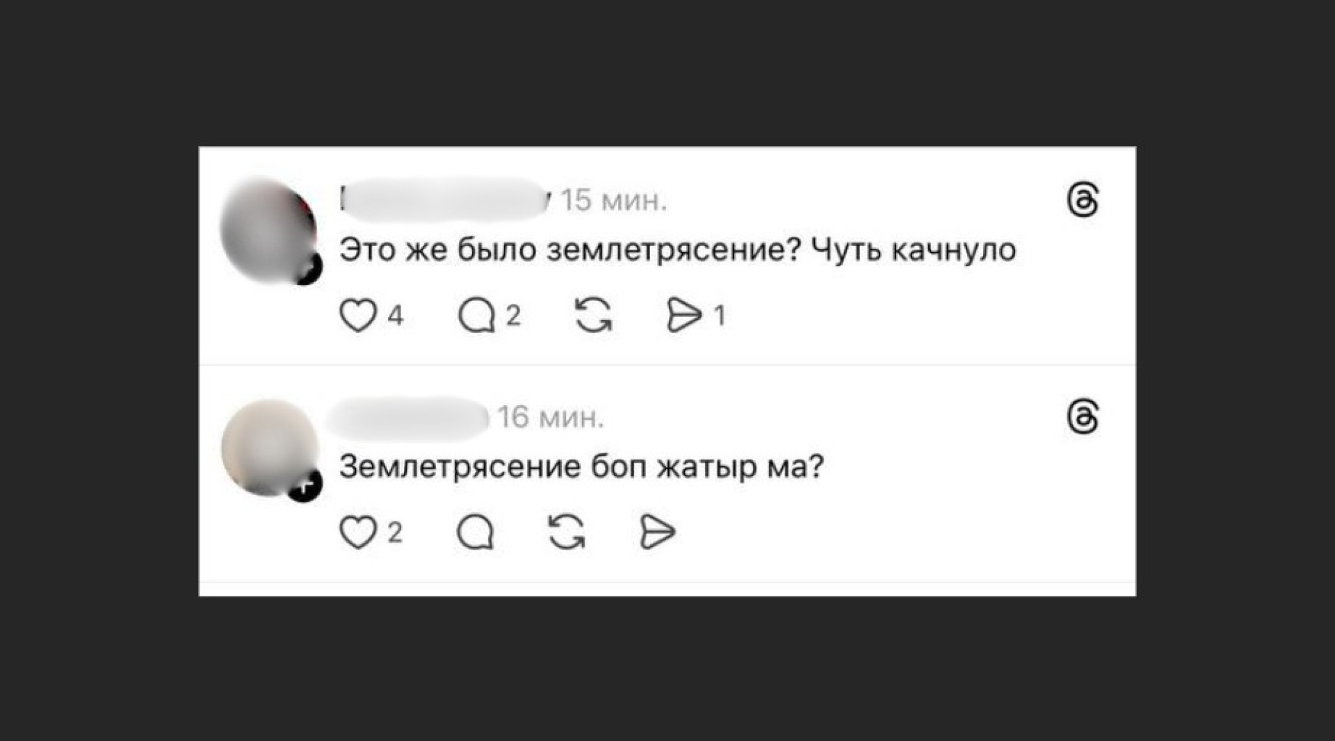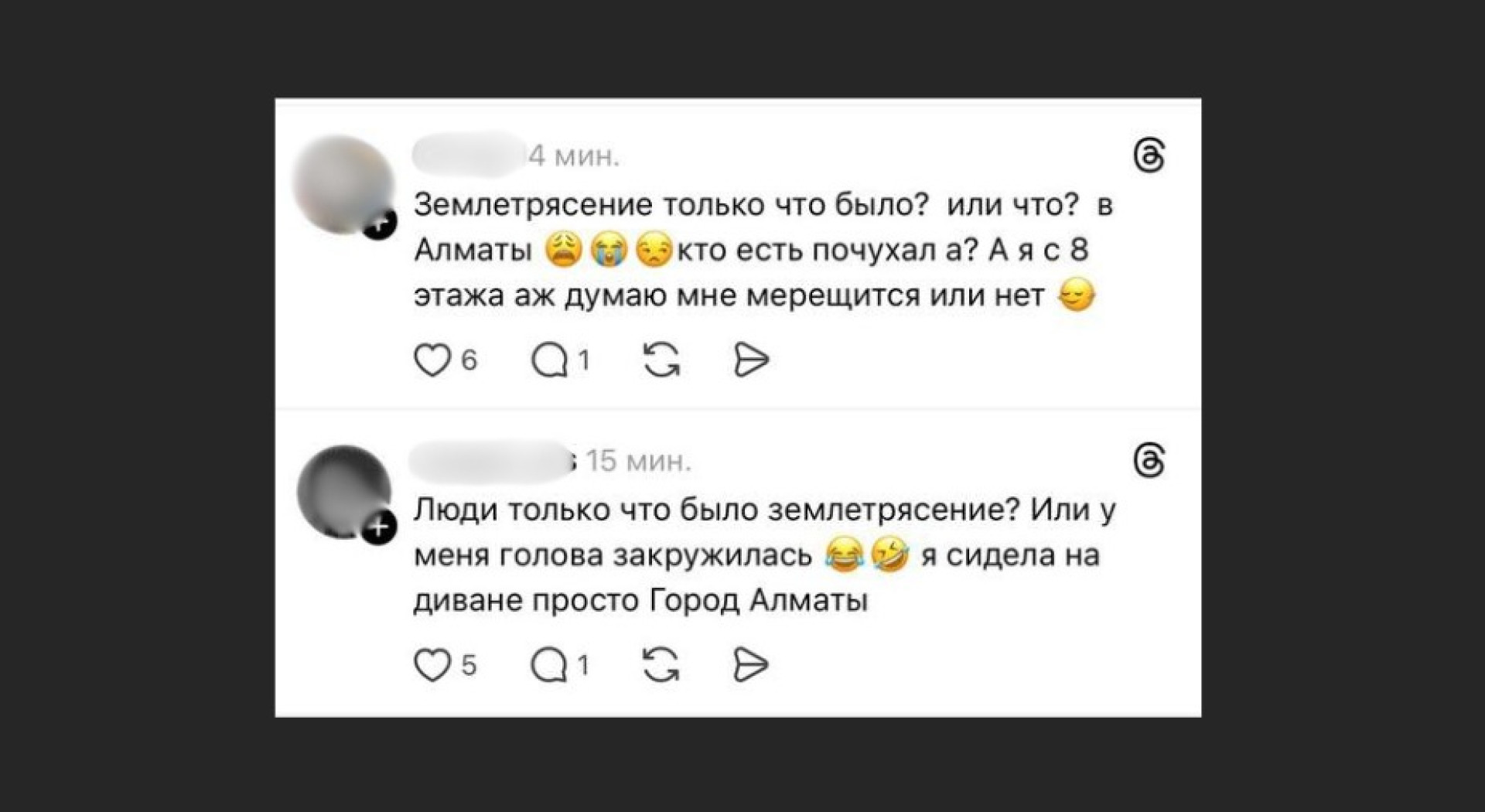 Некоторые жители Алматы в социальных сетях сообщают, что ощутили легкие подземные толчки. По их словам, в отдельных районах города была заметна небольшая вибрация. Сообщения о землетрясении начали поступать в различных социальных платформах.