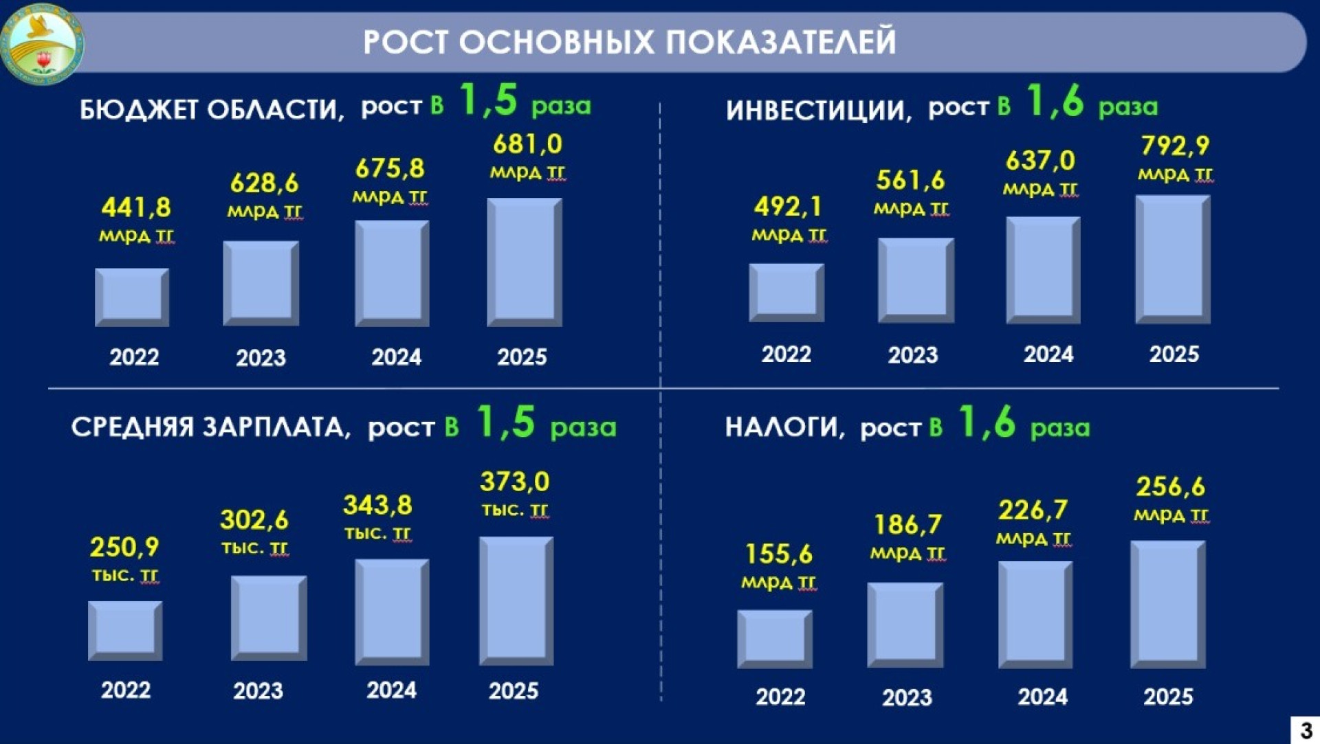 "За последние три года в регионе значительно выросли базовые экономические показатели. Областной бюджет и средняя заработная плата увеличились в 1,5 раза, инвестиции в основной капитал — в 1,6 раза. Объём прямых иностранных инвестиций за этот период составил 1,5 миллиарда долларов, а налоговые поступления выросли до 256,6 миллиарда тенге", — отметил Кумар Аксакалов.