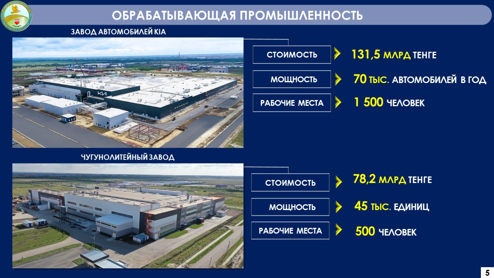 Объём промышленного производства в регионе за год составил 3,5 триллиона тенге. Реализовано семь инвестиционных проектов на сумму 322,1 миллиарда тенге, что позволило создать 3,3 тысячи рабочих мест.