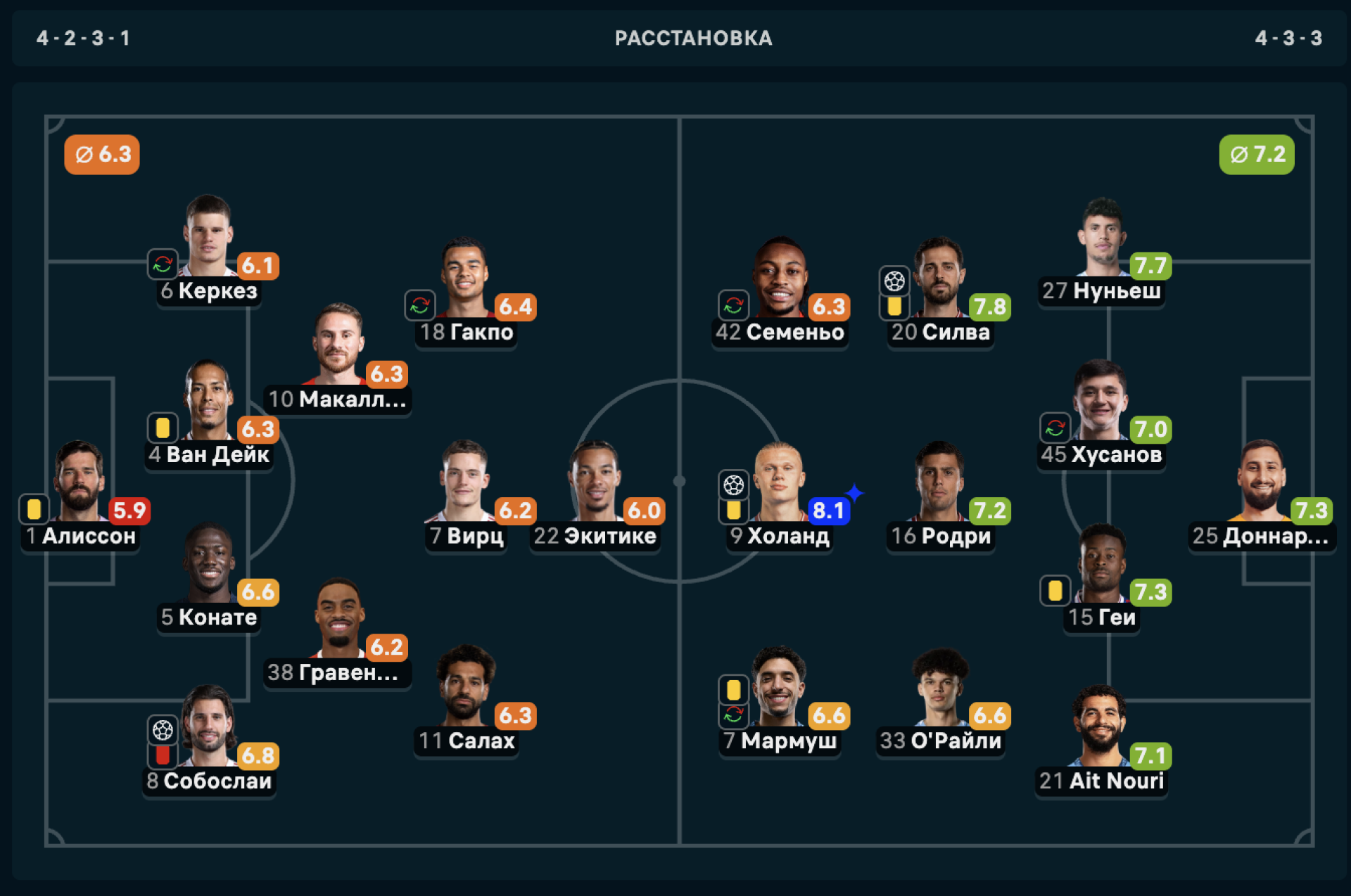 "Манчестер Сити": Доннарумма (В), Нуньеш, Хусанов, Гехи, Аит Нури, Родри, О’Райли, Силва, Мармуш, Семеньо, Холанд.