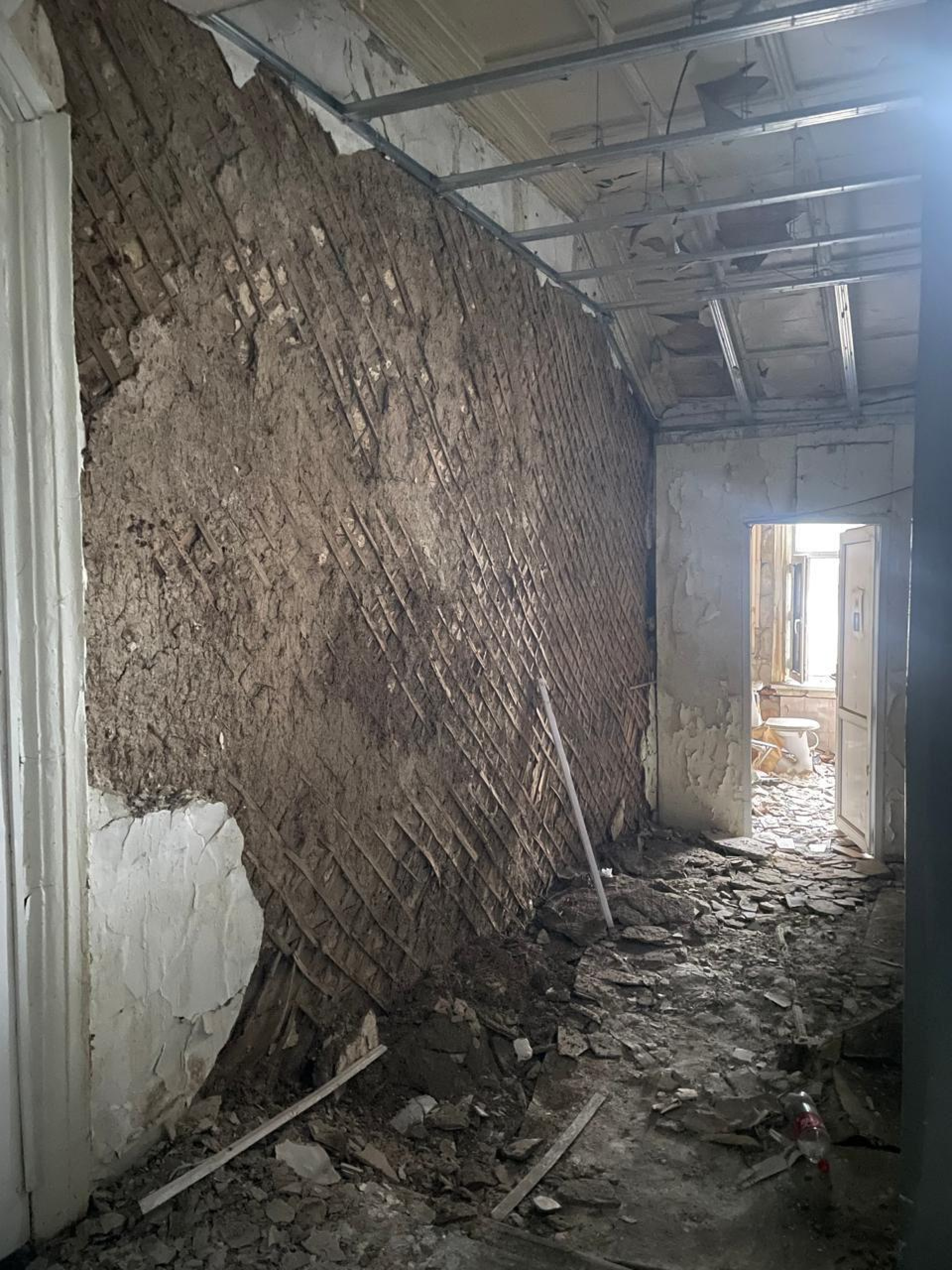 На фотографиях видно, что часть конструкций разрушена, на стенах заметны трещины. Окна и двери местами отсутствуют или повреждены, внутри видны признаки длительного отсутствия эксплуатации.